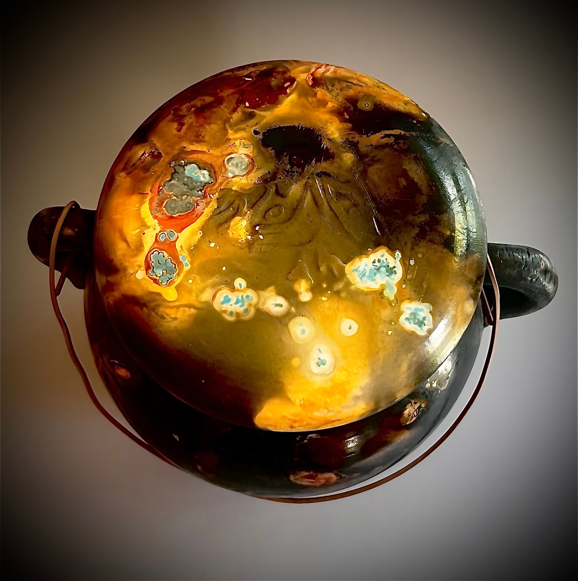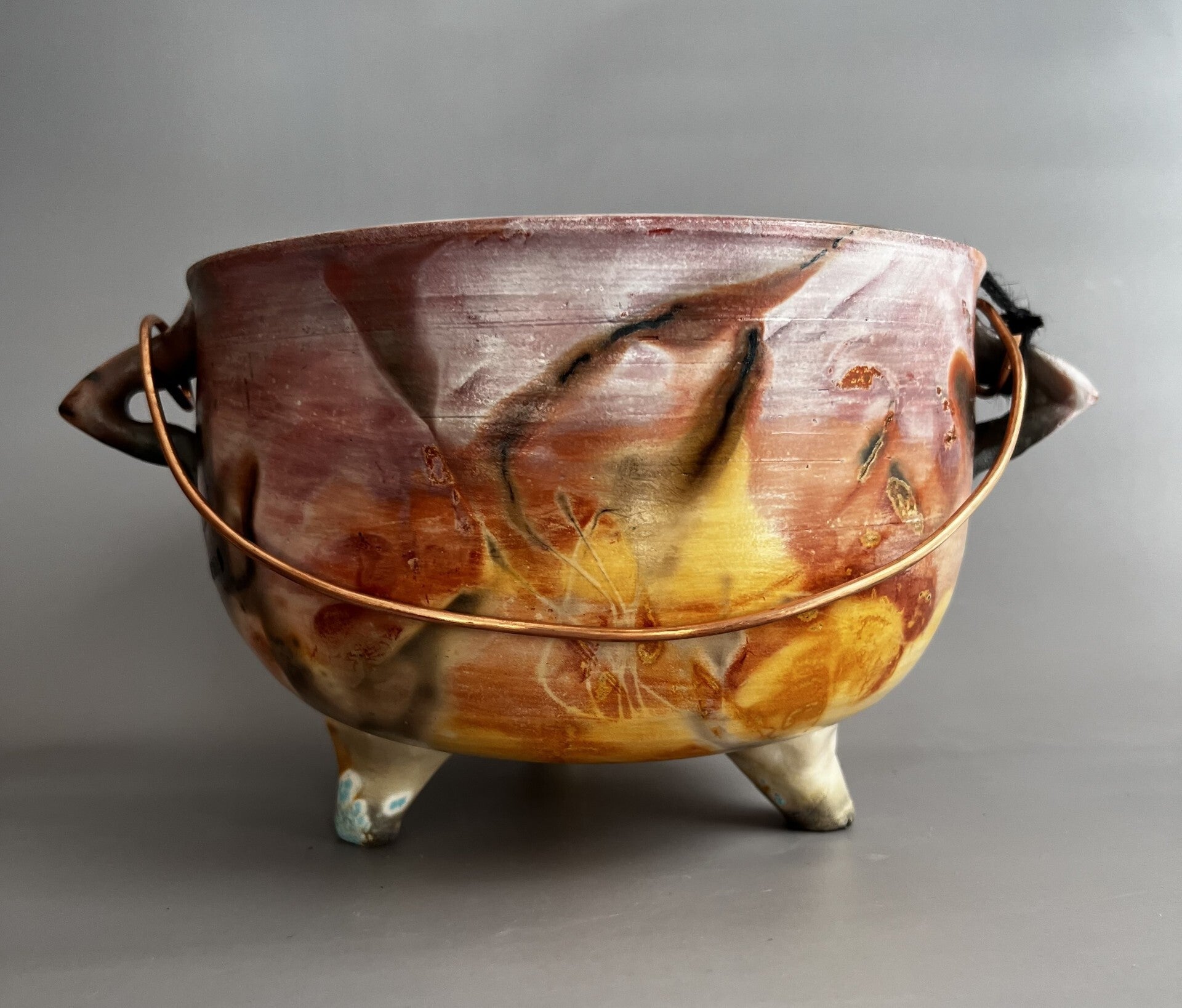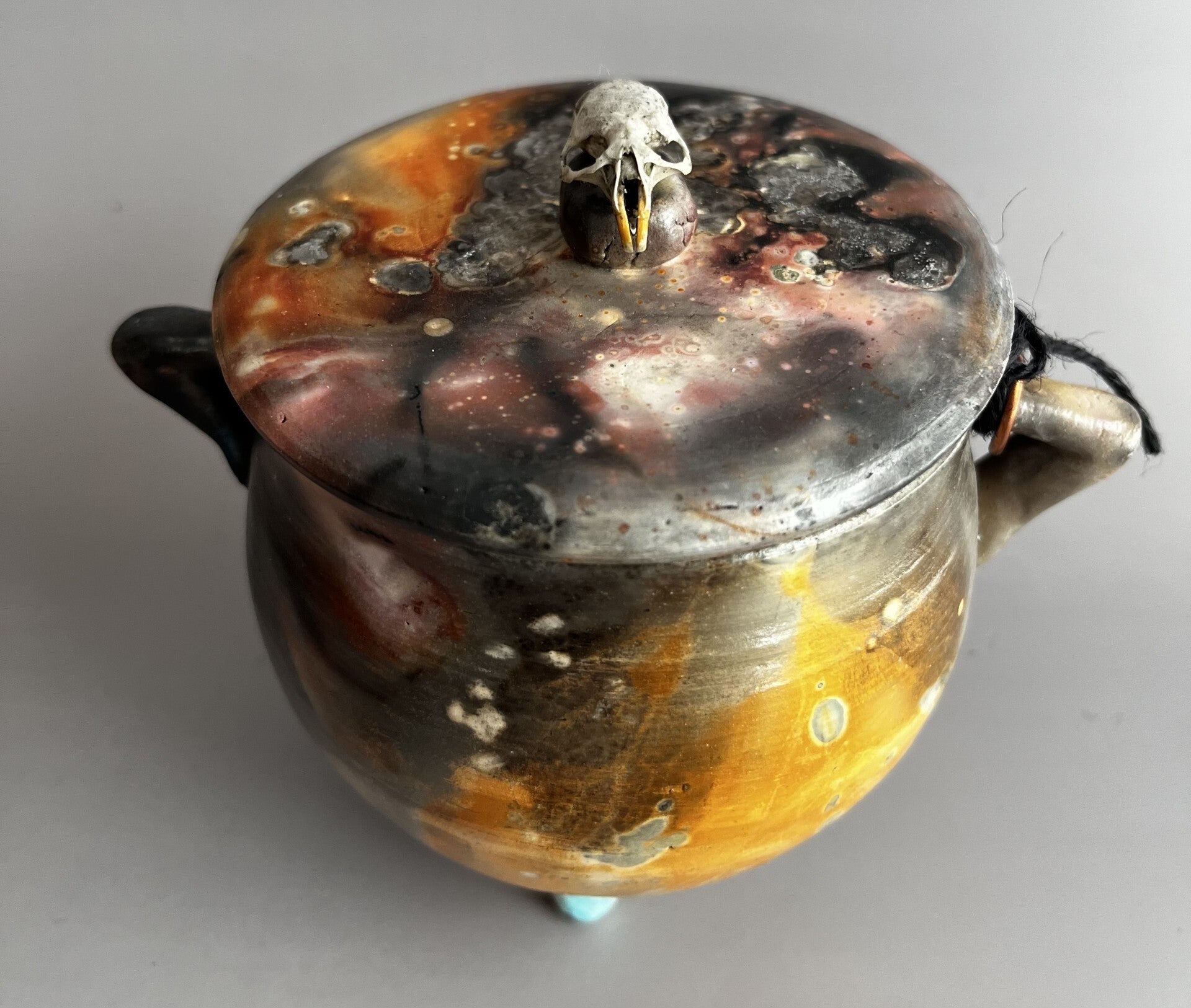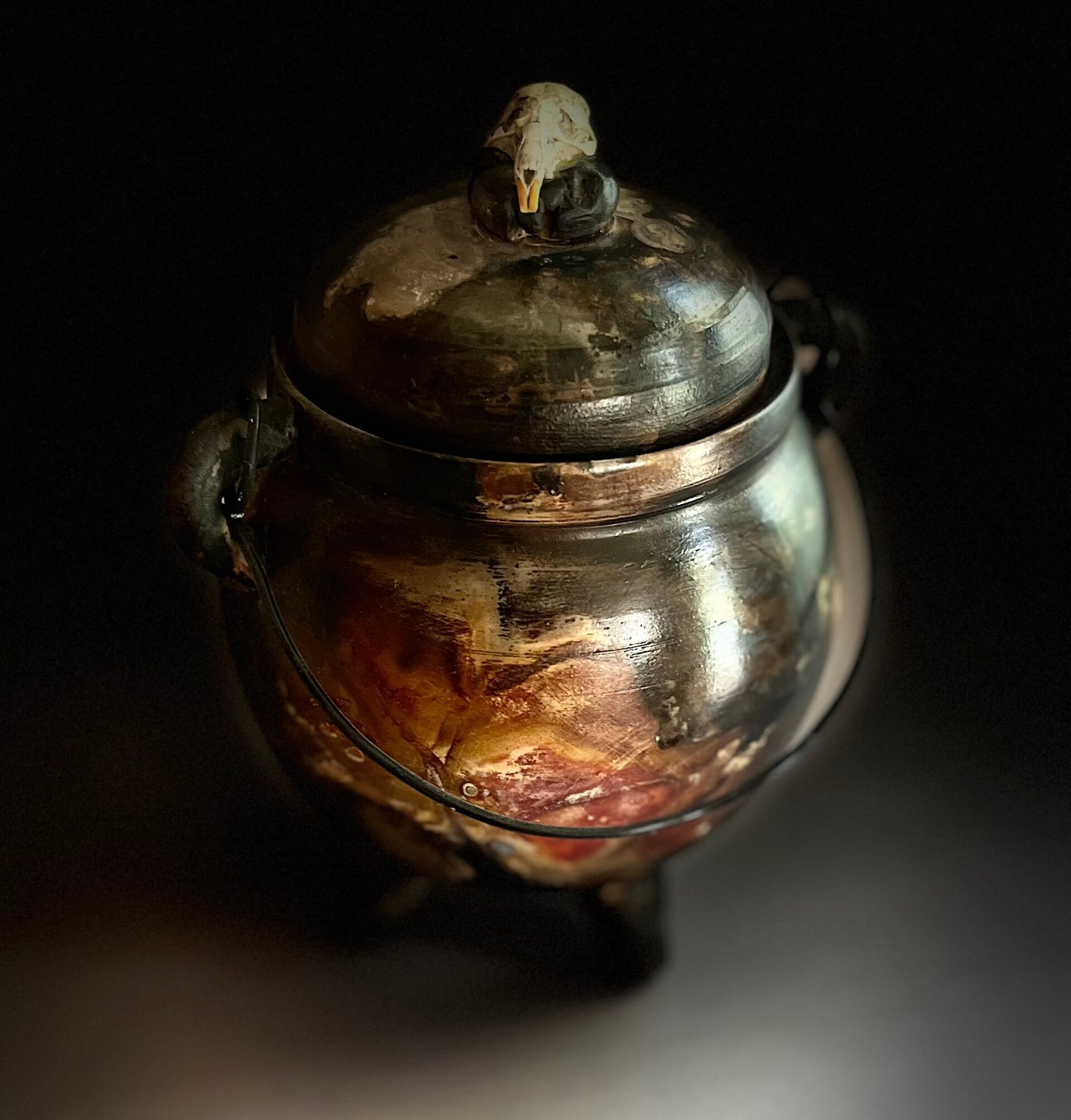 Each cauldron is a vessel of memory and magick, born of earth, air, fire, and water. Their handles are bound with broom corn from our garden and foraged wood and bone as well as copper handles.